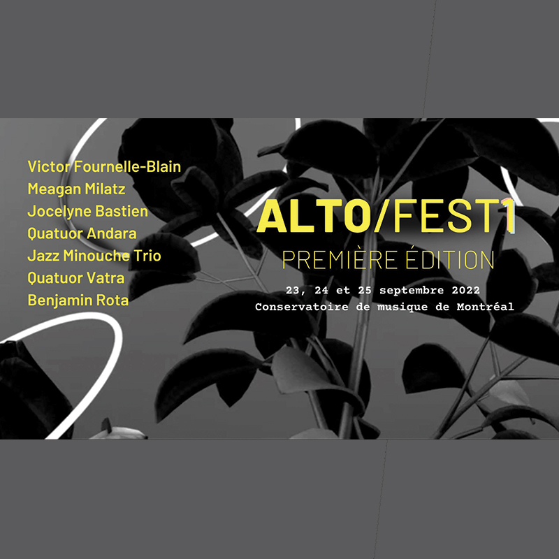 L’AltoFest!! a pour but de rassembler la communauté́ d’altistes du Québec provenant de toutes institutions et de célébrer cet instrument sous toutes ses formes. Par une programmation éclectique de concerts, de conférences et de classes de maitre, le Festival est une vitrine décomplexée des artistes de la discipline prenant place au Conservatoire de Musique de Montréal dans une ambiance festive agrémentée de dégustations culinaires.